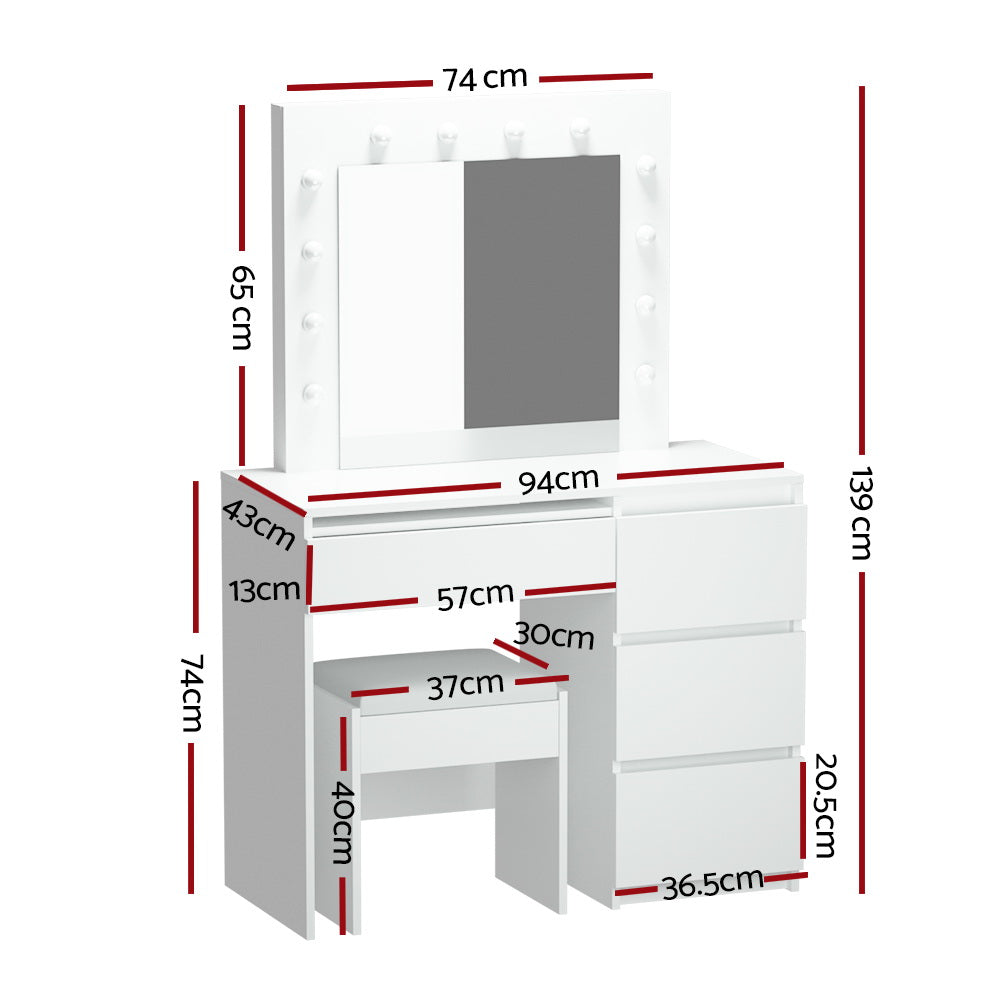 Add a touch of Hollywood glamour with the Artiss LED dressing table. It will help you achieve a flawless and well-groomed look that you'll love. With its illuminated mirror, getting ready can become less chaotic and help you put your best self forward. The LED dressing table comes with 12 LED bulbs for better illumination and clarity. It has three colour options - neutral white, warm white, and daylight white, allowing you to choose the best lighting for detailed makeup. You can even adjust the brightness to get the right look and flawless finish. This dressing table features four spacious drawers. No matter how many makeup products you have, they're sure to fit in the available space. You can group and organise your makeup essentials in each drawer, so you never struggle to find them. Our dressing table also has a soft padded stool upholstered in PU leather. It's well-constructed for your comfort and long-lasting use. Furthermore, our LED dressing table is made using an eco-friendly particle board frame with a melamine finish. It's quite sturdy and has smooth finish edges, which makes it safe to use. Not least, the dressing table is easy to clean. Just a simple wipe with a dry cloth is enough.