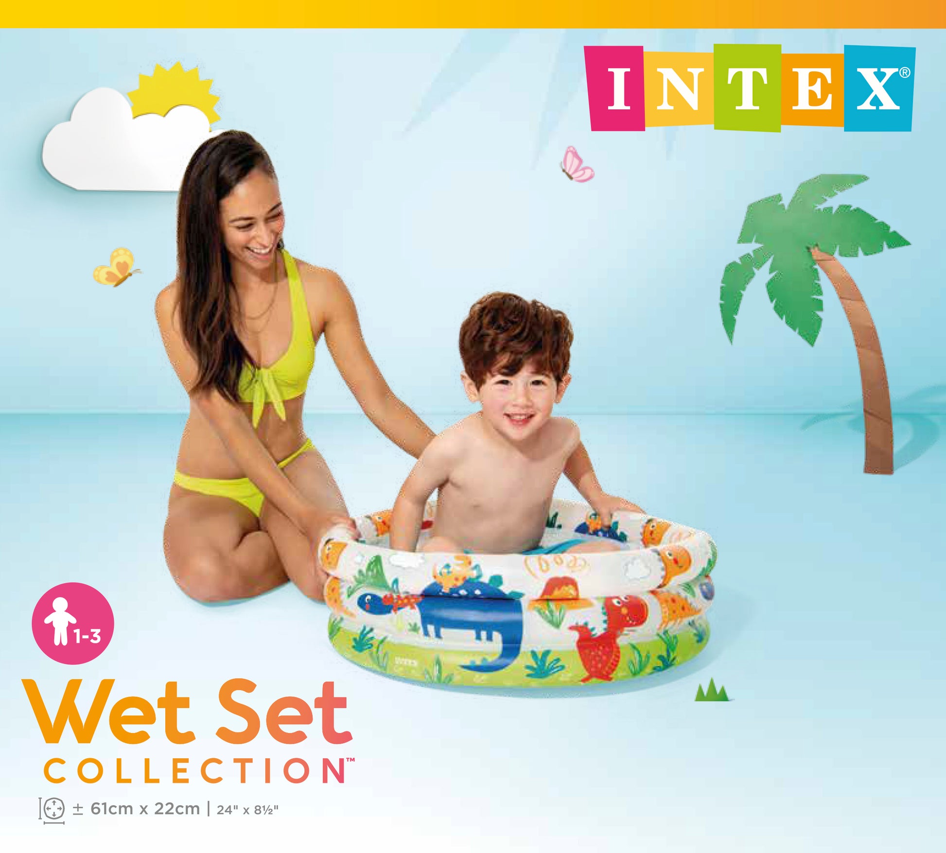 This Intex summer kiddie pool features a cute, friendly dinosaur frosted PVC design. It features soft inflatable floor for comfort. Holds up to 9 gallons of water. The maximum water depth below top ring is about 5.5 in.