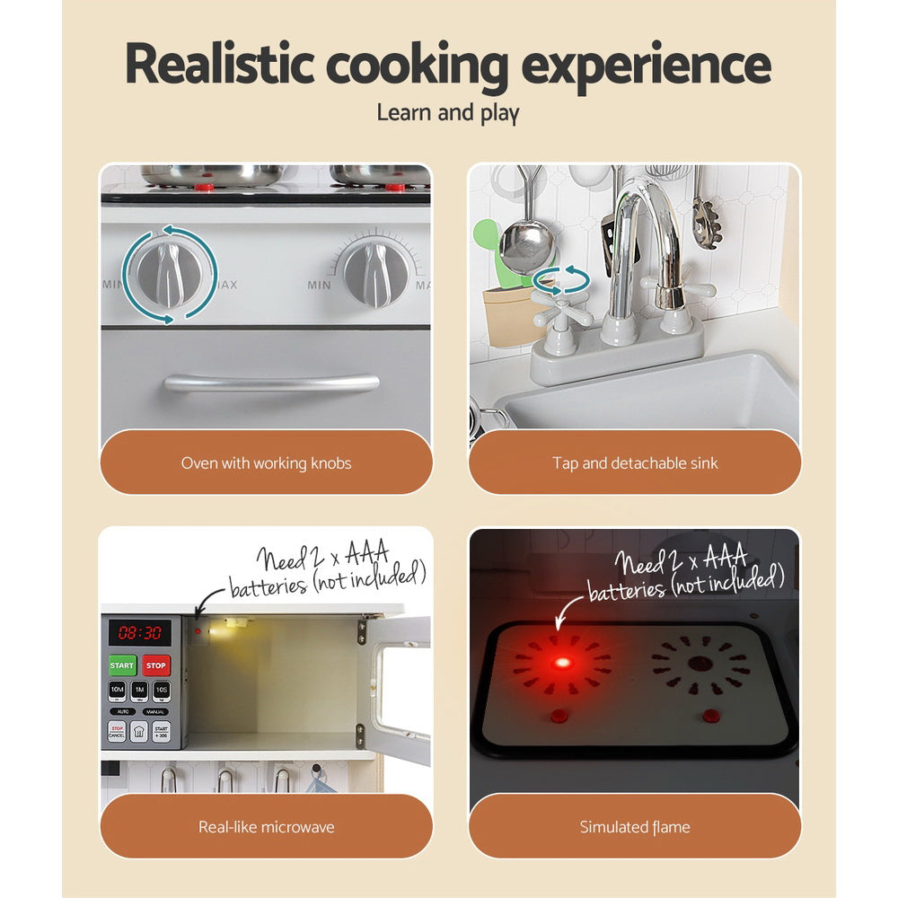 Every little aspiring chef needs their kitchen set! Let your little ones have fun cooking with our Keezi fully equipped modern kitchen play set. Our kitchen set comes with all modern kitchenware and appliances, such as a realistic rangehood with lights and fan, microwave, handy pegs, storage space, tap and removable sink, stove top and play pots, oven with working knobs and door, and cooking utensils for a real-like cooking experience. Made from a combination of solid wood and MDF, the kitchen set is sturdy and durable. It comes with safety and quality approval and non-toxic paint finish for your child’s safety. Now your young chefs can develop several basic life skills all while cooking and serving delicious meals for you. Go and get your kids in the Keezi kitchen today.